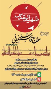 با حضور و سخنرانی سردار سرتیپ پاسدار دکتر مسجدی، سردار حیدرنیا و جمع کثیری از همرزمانش شهید سلیمانی در مورخه۱۷دی ماه از ساعت ۹:۳۰ دقیقه در سالن شهیدان نژاد فلاح کرج.
