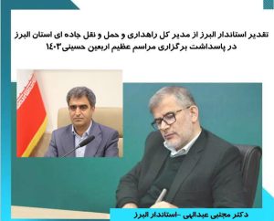 دکتر مجتبی عبداللهی استاندار البرز با ارسال نامه ای به مهندس علی زندی فر مدیر کل راهداری وحمل و نقل جاده ای استان البرز از وی به پاس همکاری در طرح جابجایی زائران اربعین حسینی در سال ۱۴۰۳ تقدیر و قدردانی کرد.