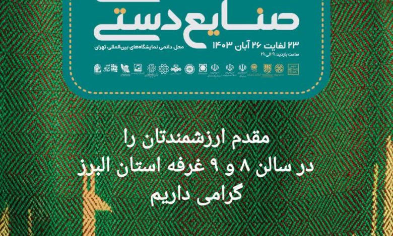 او با اشاره به اینکه سی و هفتمین نمایشگاه ملی صنایعدستی از تاریخ۲۳ تا ۲۶ آبان از ساعت ۹ تا ۱۹ در محل نمایشگاههای دائمی بینالمللی تهران برگزار میشود، تصریح کرد: پاویون استان البرز در سالن ۸ و۹ قرار دارد.