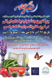 مدیرکل میراث فرهنگی گردشگری و صنایع دستی استان البرز از برگزاری بزرگترین جشنواره یلدای ایرانی در کاروانسرای شاه عباسی کرج از تاریخ ۲۶ آذر تا ۵ دی خبر داد. به گزارش روابط عمومی اداره کل میراثفرهنگی، گردشگری و صنایعدستی استان البرز رحیم خاکی اظهار کرد: این جشنواره با حضور هنرمندان صنایع دستی مطرح کشور و استان و اجرای برنامههای فرهنگی و هنری در کاروانسرای شاه عباسی برگزار میشود.