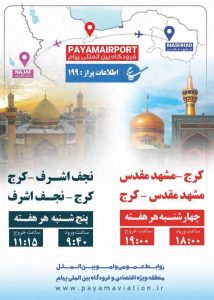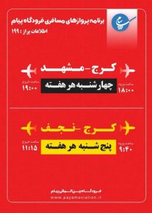 معاون هوانوردی و امور فرودگاهی فرودگاه بین المللی پیام خاطر نشان کرد: همچنین پروازها از مبدا فرودگاه بین المللی پیام به مقصد نجف اشرف از پانزدهم دی ماه و در روزهای پنجشنبه انجام خواهد شد.