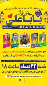 سازمان فرهنگی ورزشی شهرداری کرج به مناسبت روز پدر و میلاد حضرت علی(ع) جشن بزرگ بابا علی را با حضور کمدین های محبوب کشور در سالن فرهنگی ورزشی شهدای شهرداری کرج برگزار می کند.