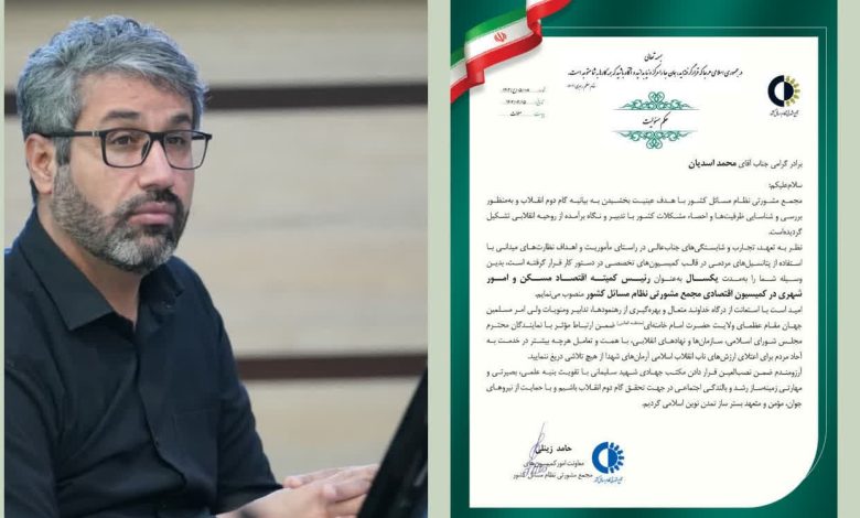 گفتنی است ، حامد زینلی معاونت امور کمیسیون های مجمع مشورتی نظام مسائل کشور در راستای ماموریت و اهداف نظارت های میدانی با استفاده ازپتانسیل های مردمی در قالب کمیسیون های تخصصی محمد اسدیان را به مدت یکسال طی حکمی به این سمت منصوب کرد.