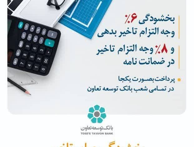 با توجه به مصوبه هیات مدیره بانک توسعه تعاون در خصوص طرح بخشودگی جرائم تاخیر تادیه تسهیلات و تعهدات، مشتریانی که بدهی سررسید شده خود را بصورت یکجا پرداخت نمایند و از این طریق مطالبات آنها بروز و یا تسویه شود، مشمول بخشودگی وجه التزام تاخیر تادیه دین میگردند.