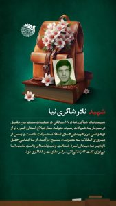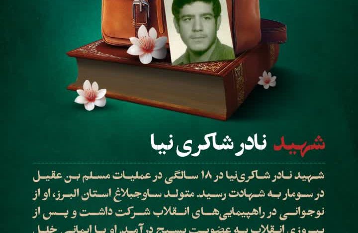 میان غبار سومار و شوقِ بیپایان پرواز، قصهای از کرج به آسمان رسید. نادر شاکرینیا، فرزند ابوالفضل، پسری از کوچههای ساوجبلاغ، که دستهای زحمتکش پدر را میگرفت و لبخند مادر را به وسعت بچههای انقلاب بخشید. او تنها ۱۸ بهار را با پرچم عشق پیمود تا در فضای عملیات مسلمابنعقیل، فصل نهایی زندگیاش را بنویسد.