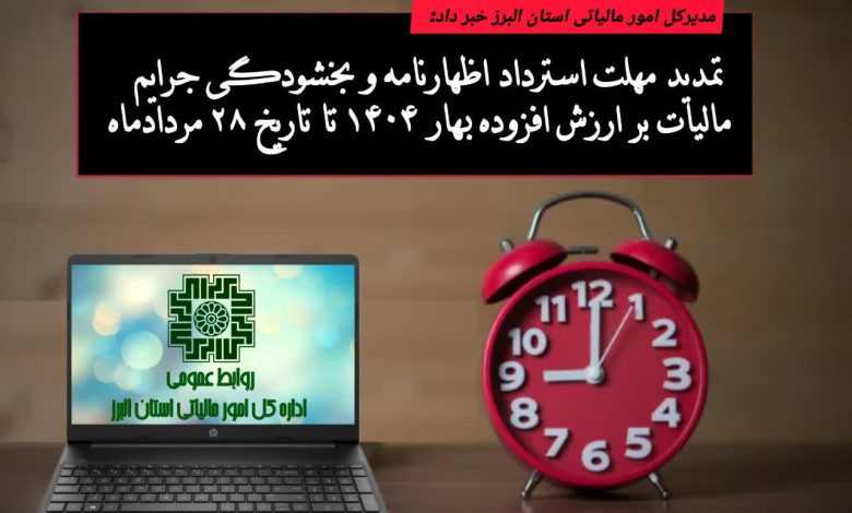 مدیرکل امور مالیاتی استان البرز از صدور اطلاعیه سازمان امور مالیاتی کشور در خصوص تمدید مهلت استرداد اظهارنامه مالیات بر ارزش افزوده مربوط به دوره بهار سال ۱۴۰۴ و بخشودگی جرایم ماده ۳۷ قانون مالیات بر ارزش افزوده، تا تاریخ ۲۸ مرداد ۱۴۰۴ خبرداد.