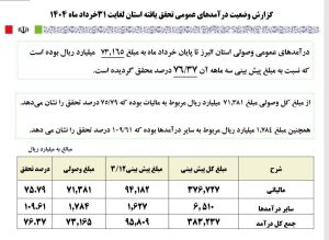 درآمدهای عمومی وصولی استان البرز به مبلغ 73 هزار و 165 میلیارد ریال بوده است که نسبت به مبلغ پیش بینی سه ماهه آن 76/37 درصد محقق گردیده است.