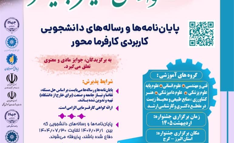 رئیس جهاد دانشگاهی استان البرز از آغاز ثبتنام پنجمین جشنواره ملی امیرکبیر (پایاننامهها و رسالههای دانشجویی کاربردی کارفرمامحور) خبر داد و گفت: این جشنواره با هدف تقویت ارتباط دانشگاه با صنعت و جامعه و با رویکرد «پژوهش تقاضا محور و مسئلهمحور» در اردیبهشتماه ۱۴۰۵ به میزبانی استان البرز برگزار میشود.