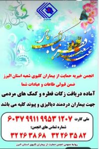 انجمن خیریه حمایت از بیماران کلیوی شعبه استان البرز اعلام کرد: دریافت زکات فطره و کمک های مردمی برای بیماران دیالیزی و پیوند کلیه