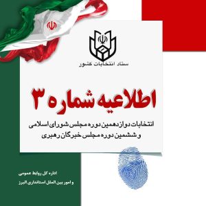 به گزارش اداره کل روابط عمومی و امور بین الملل استانداری البرز به نقل از پایگاه اطلاع رسانی وزارت کشور، متن اطلاعیه شماره ۳ ستاد انتخابات کشور به شرح زیر است: